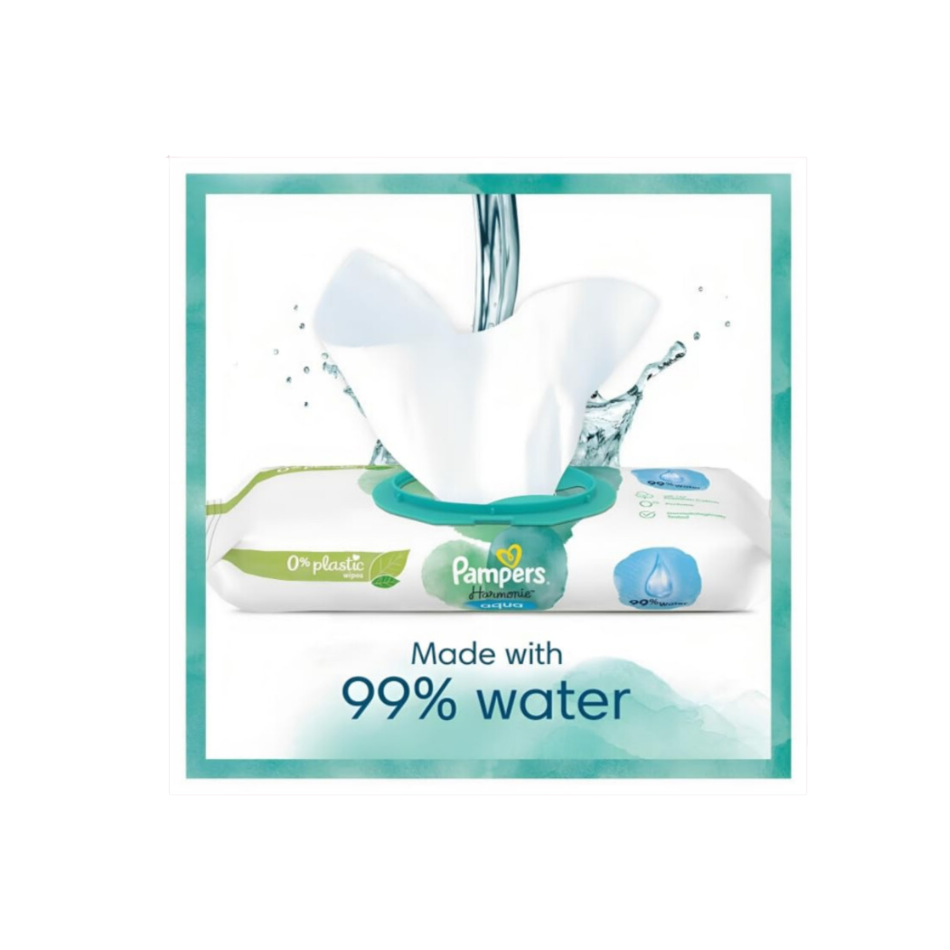 Pielea nou-nascutilor este foarte delicata si merita o protectie blanda, incepand cu schimbarea scutecului. Servetelele umede pentru bebelusi Pampers Harmonie Aqua contin 99% apa pentru o protectie pura a pielii. Acestea contin 0% plastic si sunt fabricate din bumbac premium: 100% fibre pe baza de plante.